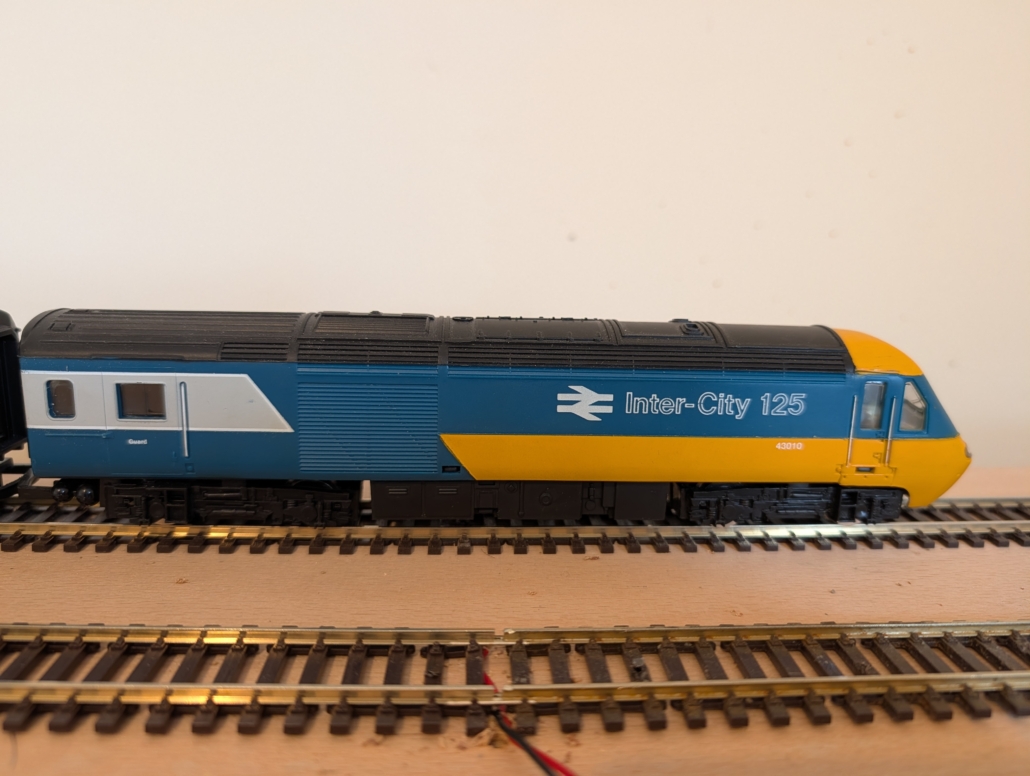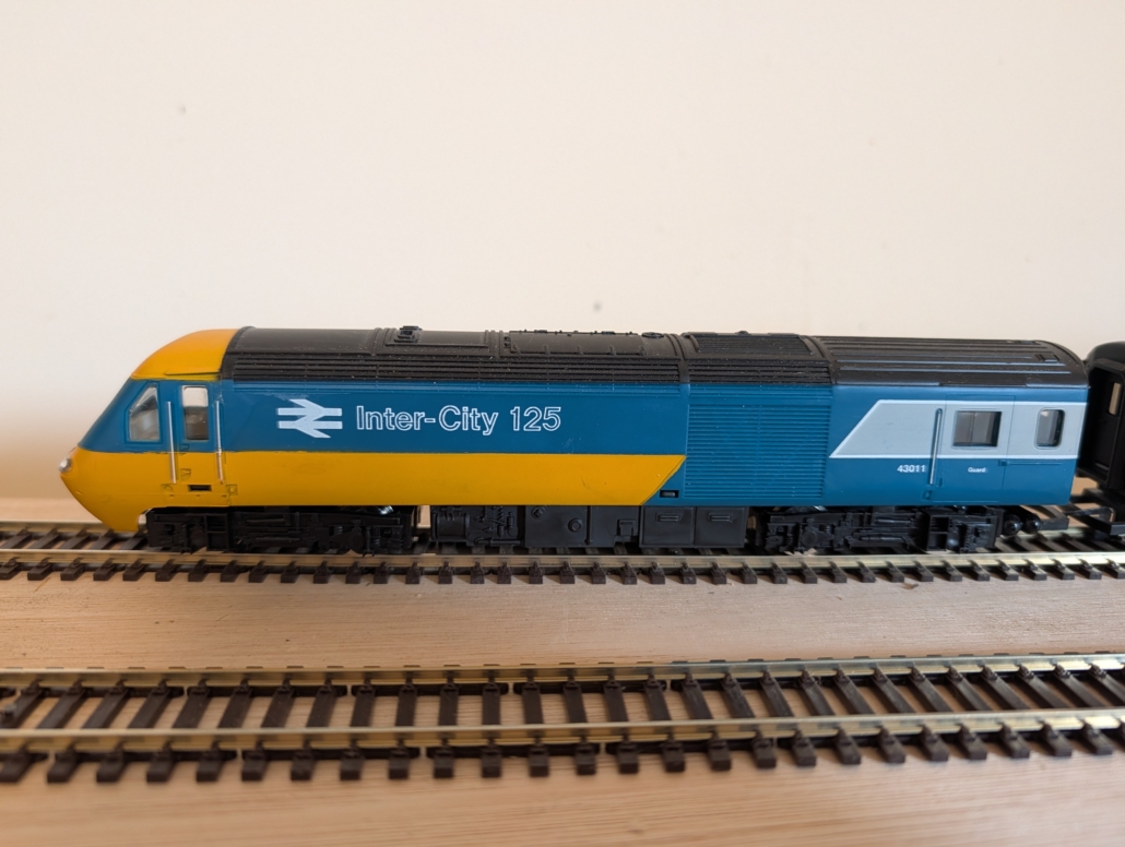 Hornby Class 43 in BR Blue . The HST Set is in excellent condition and has been recently been serviced and ready to run. The coaches are in good condition and two cupling hooks missing easy replaced see photos. The set is un boxed.